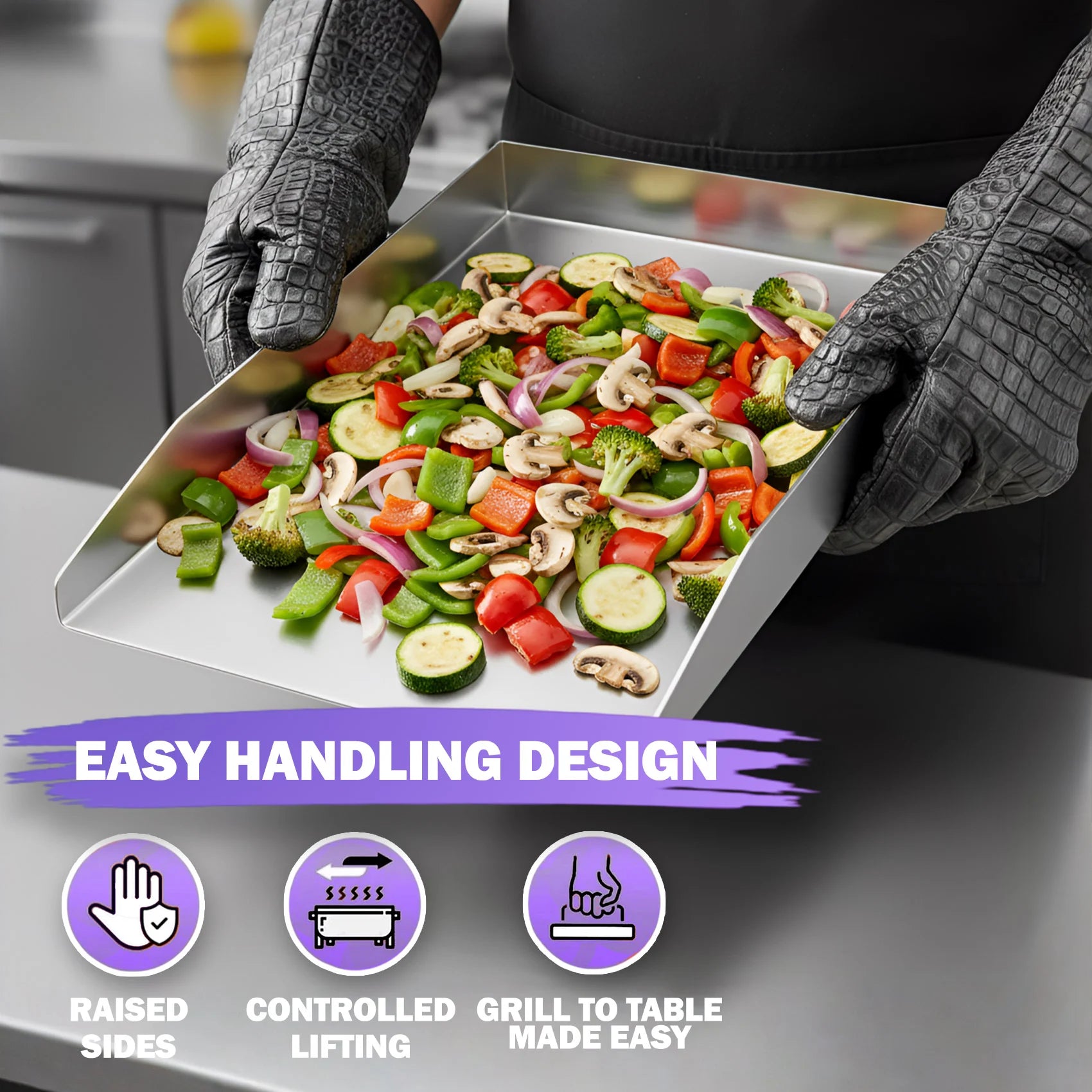 The raised edges help prevent food from sliding off and keep oils, marinades, and juices contained. They also provide a more secure edge to grip when positioning or lifting the plate (once cooled), making handling and cleanup easier—especially when moving it on and off the grill.