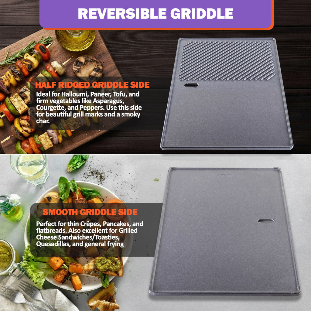 - ✅ Päivitetty muotoilu: Kaksipuolinen – sileä puoli paistamiseen + uritettu puoli parilajälkien tekemiseen; integroitu rasvanpoistoaukko terveellisempiä lopputuloksia varten.