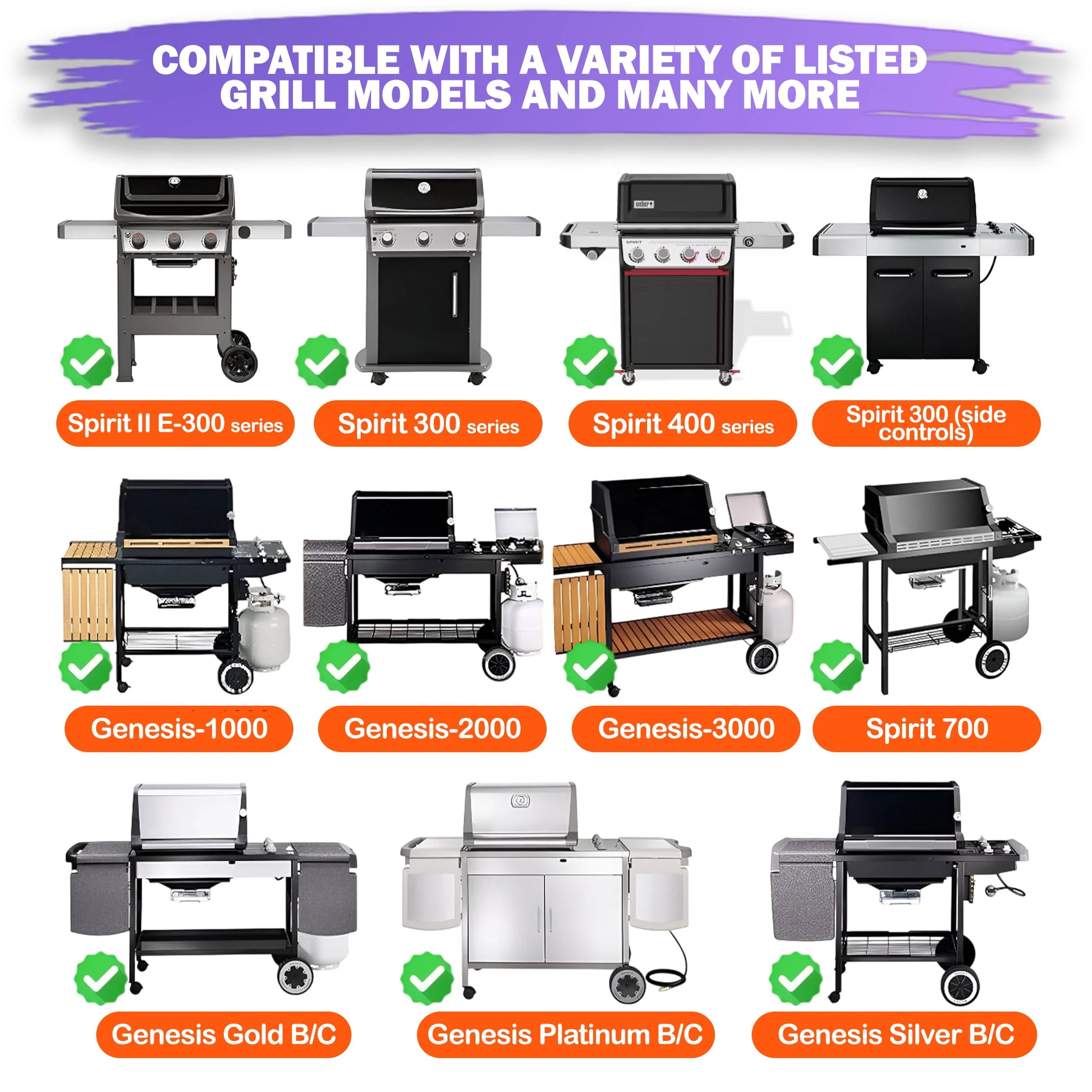 • Weber Genesis (I–IV) / 1000–5000 Series: Genesis 1000; Genesis 1100; Genesis 2000; Genesis 2100; Genesis 3000; Genesis 3200; Genesis 3300; Genesis 4000; Genesis 5000