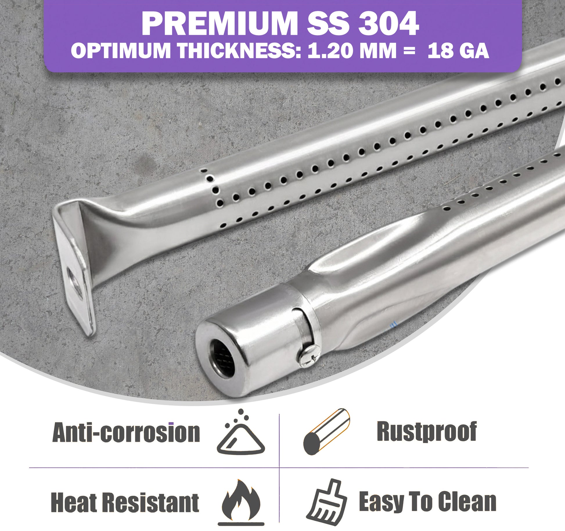 Jokaisen posliiniemaloidusta teräksestä valmistetun lämmöntasauslevyn mitat ovat 41 cm (pituus) × 8,9 cm (leveys) ja sen paksuus on 1,4 mm, mikä auttaa suojaamaan polttimia ja parantamaan lämmönjakautumista. Jokainen ruostumattomasta teräksestä valmistettu poltin on noin 43,1 cm pitkä ja valmistettu kestävästä 1,2 mm paksusta 304-ruostumattomasta teräksestä, mikä takaa luotettavan kaasun virtauksen ja pitkän käyttöiän.