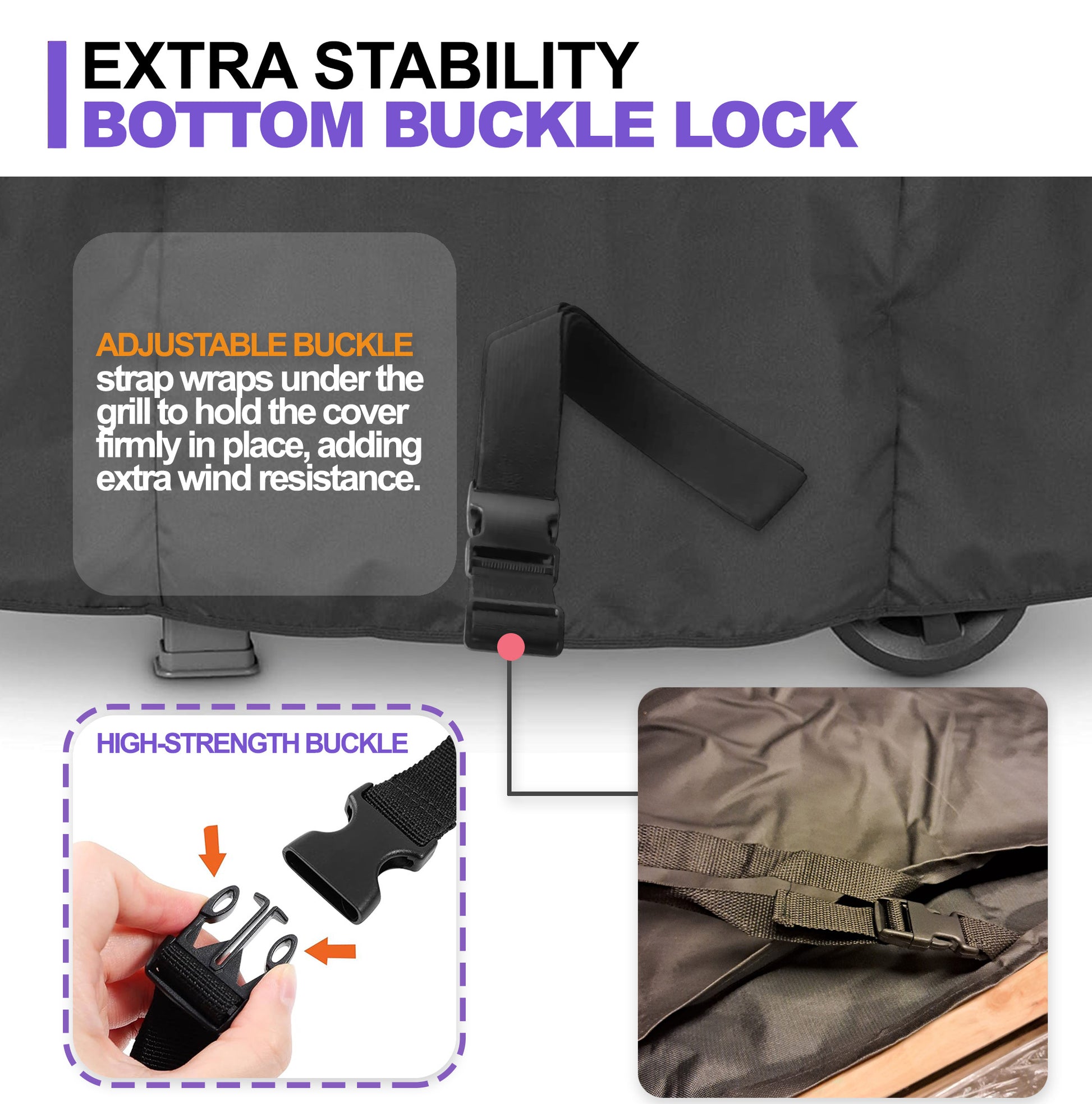 - ✅ Secure Fit: Features an adjustable buckle strap underneath the grill and Velcro straps on both sides to keep the cover firmly in place even in windy conditions.