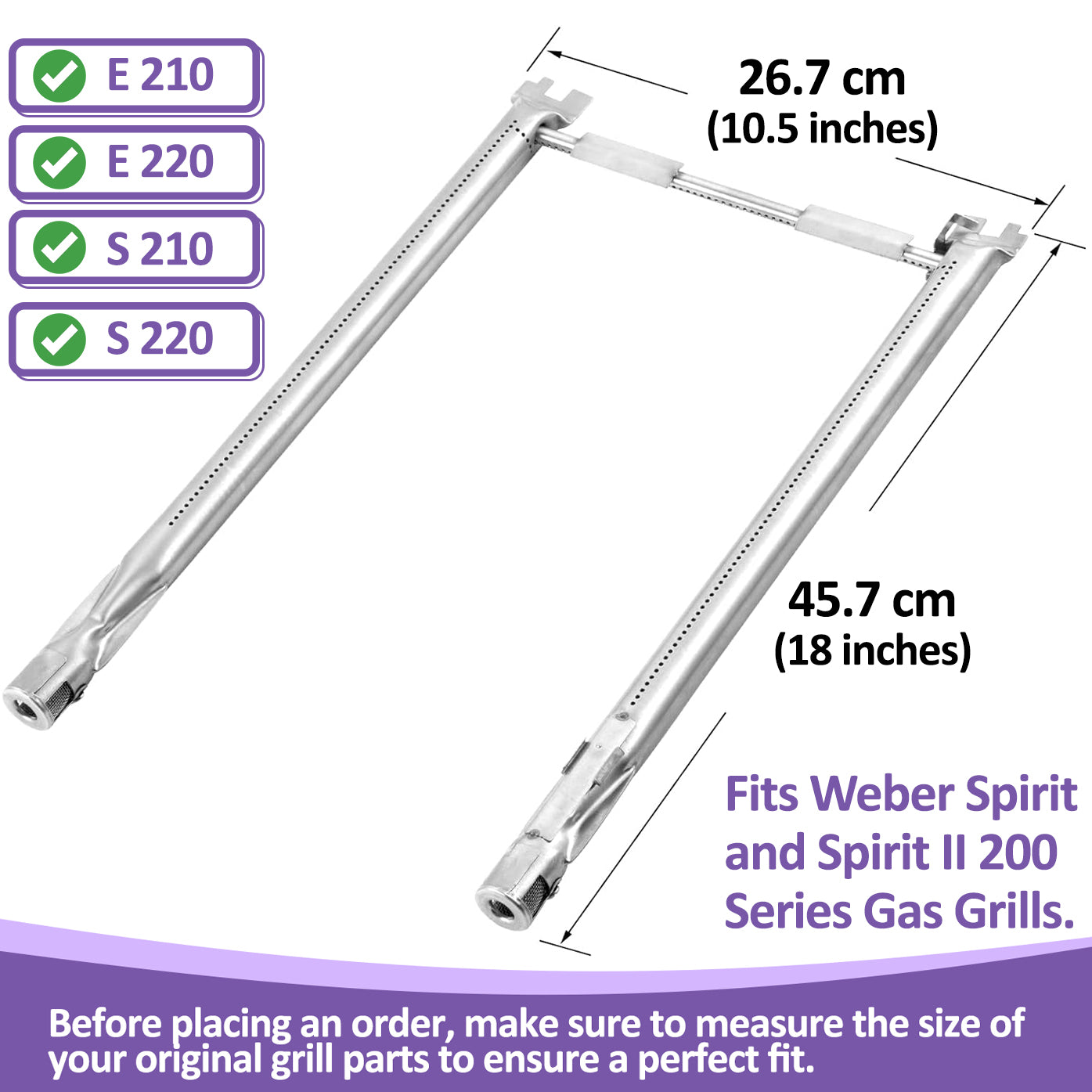 ✅ Dimensions: Each burner tube measures 45.7 cm in length and the crossover tube measures 26.7 cm.