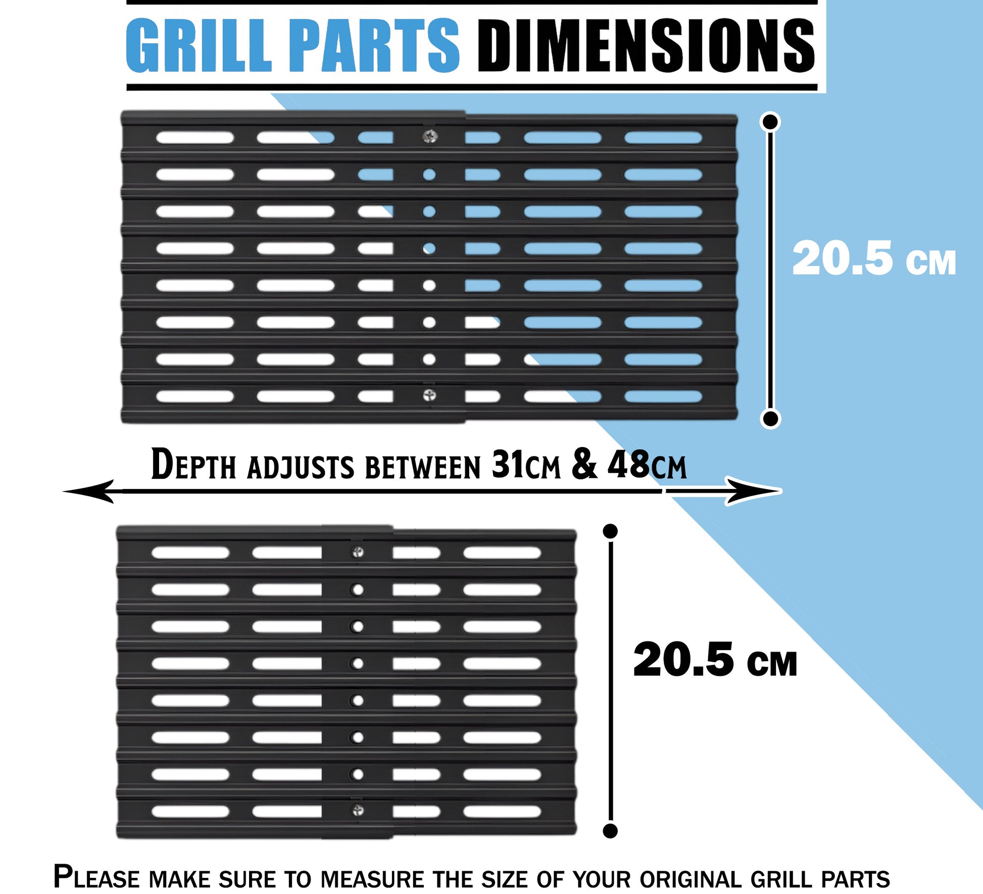 ✅ Dimensions: Each Universal grill grid is 20.5 cm wide, and the depth adjusts between 31 cm to 48 cm. Total width coverage: 61 cm with 3 grids. (Before ordering, make sure to measure the size of your original cooking grill grate to ensure a perfect fit)
